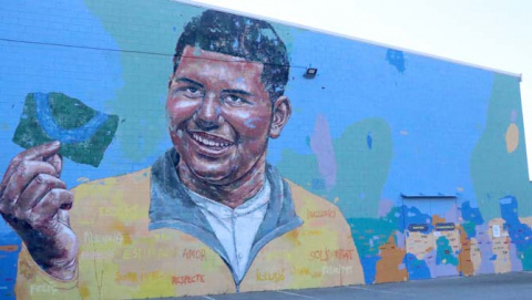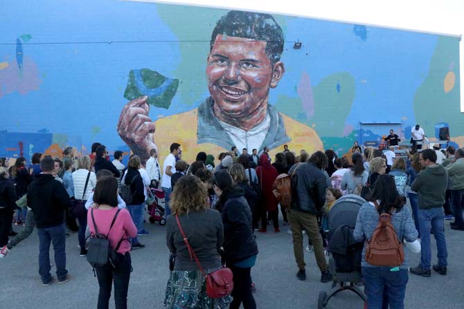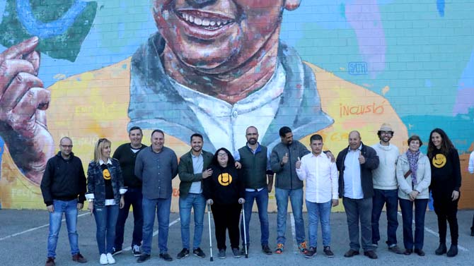 Youssef El Hamdachi, vecino de Felanitx y alumno del Centre d'Esducació Especial Joan Mesquida, protagoniza el nuevo mural participativo Som-riu de la Fundació Aproscom, que ha consolidado su brillante iniciativa en la Part Forana de Mallorca.