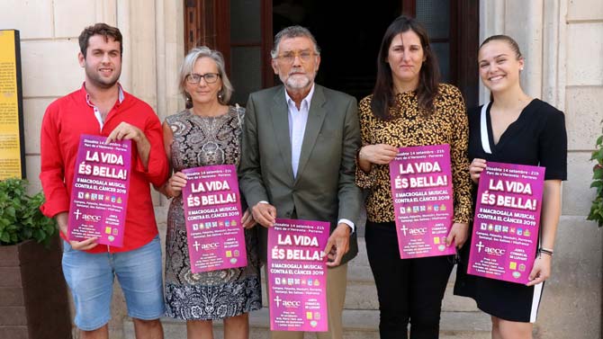 La II macrogala musical contra el càncer "La vida és bella" que se celebra dissabte, dia 14 de setembre, a les 21.00 h, al parc de n'Hereveta de Porreres, ha estat presentada avui a l'Ajuntament porrerenc amb l'assistència de batles i regidors dels pobles organitzadors (Porreres, ses Salines, Campos, Felanitx, Montuïri, Vilafranca i Santanyí) i d'altres que pertanyen també a la junta comarcal de Llevant de l'Associació Espanyol Contra el Càncer (AECC), i que col·laboren també en l'esdeveniment com són Artà, Sant Joan o Vilafranca.