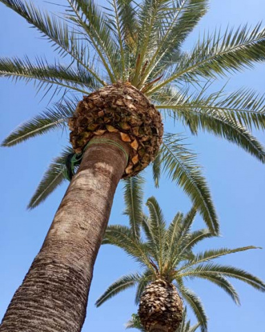 Una altra de les tasques que s'han dut a terme és la poda de les palmeres, han estat sanejades de fulla vella i descarregades de violes. Diàriament el fruit de les palmeres cau enterra, pot provocar una esllavissada d'un vianant i a més taquen la via.