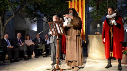 Després de les seves paraules, Tomeu Matamalas ha convidat l’actor manacorí Toni Gomila a acostar-se al micròfon que, vestit de Ramon Llull, han iniciat un petit espectacle invocant una lletania de noms i figures de la ciutat.