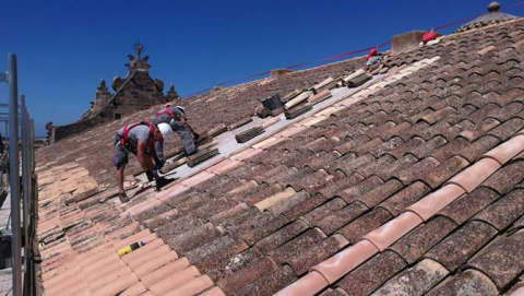 Fa uns dos anys que s'observava com un bon grapat de files de teules s'havien desplaçat (en podeu veure fotografies de l'abans). S'havia d'intervenir aviat per evitar danys majors a un edifici restaurat fa 11 anys. S'han aixecat totes les teules i s'amorteren, llevat d'alguns pocs indrets. La parròquia ha hagut de sol•licitar un nou préstec. Compartim imatges, algunes realment espectaculars.