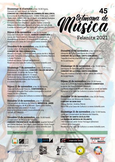 L’Ajuntament de Felanitx ha presentat la Setmana de la Música que es perllongarà durant quatre caps de setmana al municipi. La quaranta cinquena edició comptarà amb audicions comentades de Bach i Mozart, concerts de l’Orquestra de Cambra de Mallorca, la Coral Units Com Brins o la Banda de Música de Felanitx entre d’altres. Al Conservatori de Música es realitzarà Òpera amb titelles, acollirà la presentació del disc de Big Babo i la Banda de Música de Felanitx oferirà el tradicional concert en honor a Santa Cecília al seu Jardí titulat 100% Natural.