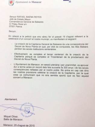 El  Alcalde de Manacor, Miquel Oliver, firmó anteayer una carta dirigida al Jefe del Estado Mayor de la Comandancia General de Baleares rechazando su petición de que se facilitase un local a la unidad de música militar para la realización, el próximo 25 de septiembre, de un concierto en conmemoración del III Centenario de la creación de la Capitanía General de Baleares.